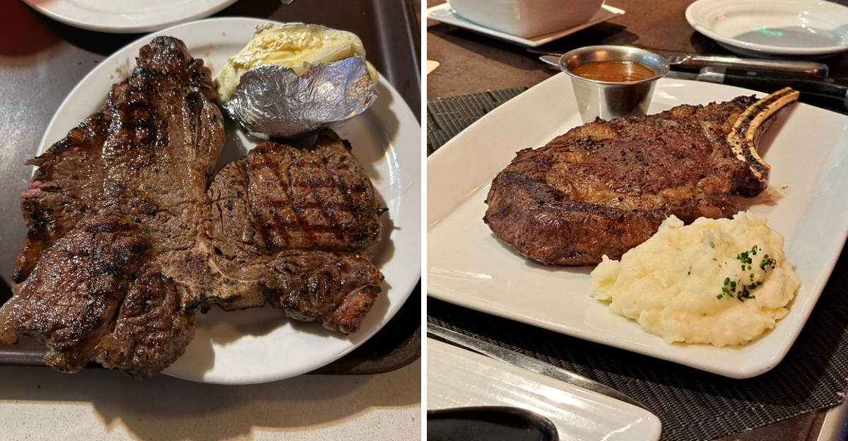The steaks here are cooked over an open flame, creating that smoky, charred exterior that steak purists dream about. The T-bone is massive and flavorful, giving you the best of both worlds with tender filet on one side and rich strip on the other.