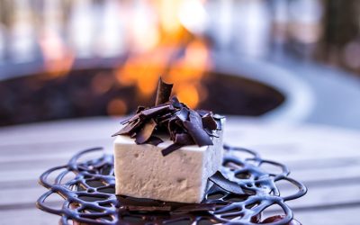 This Haute Chocolate at the Vail Four Seasons Resort in Vail CO is rich chocolaty goodness poured over a house made marshmallow and a lace of dark chocolate into a giant cup.