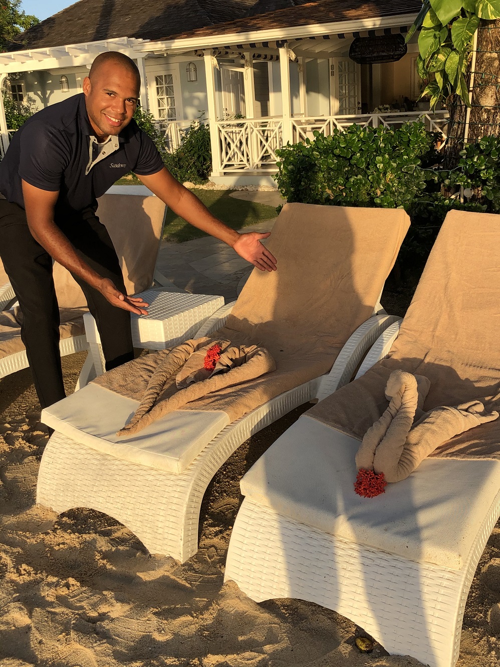 Our beds are made complete with animals fashioned out of towels. There is no jockeying for beach chairs here and yes, our butler, Hamantro Mitchell, fashions towel animals here as well. “I practice a lot,” he says. Maybe he will teach me before we leave…
