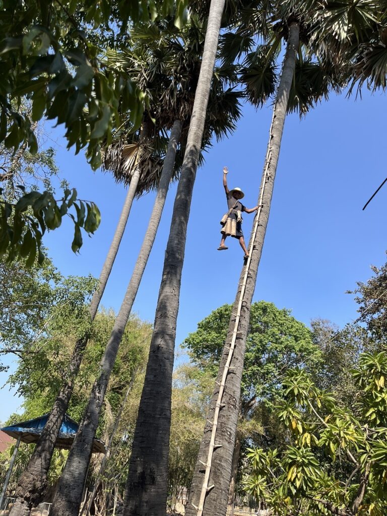 In his seventies, “Happy Man” explained that he stopped climbing last year—he had started when he was 16–when he fell from a tree. The very strong palm wine infused with herbs—he gave us a taste—greatly helped his recovery, he said. His nephew, Chan Keo, 35, showed us how he climbs one of the family’s trees on a ladder fashioned from a bamboo branch to get the sap, crossing a bamboo bridge near the top to a second tree. It takes 100 liters of sap to make just 10 kg of palm sugar, and the trees must be tapped twice daily. Certainly not an easy way to make a living.