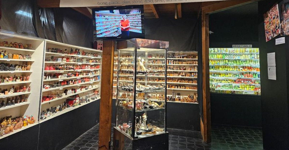 Glass cases line the walls and fill the room, each one packed with shakers organized by theme, material, era, and country of origin.