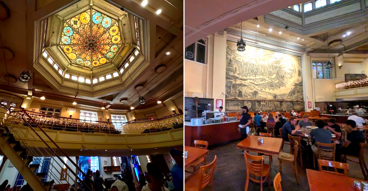 The eight-sided stained-glass dome at the center of the ceiling is one of the most genuinely beautiful architectural features inside any restaurant in New York City, and it was not designed for a restaurant at all.