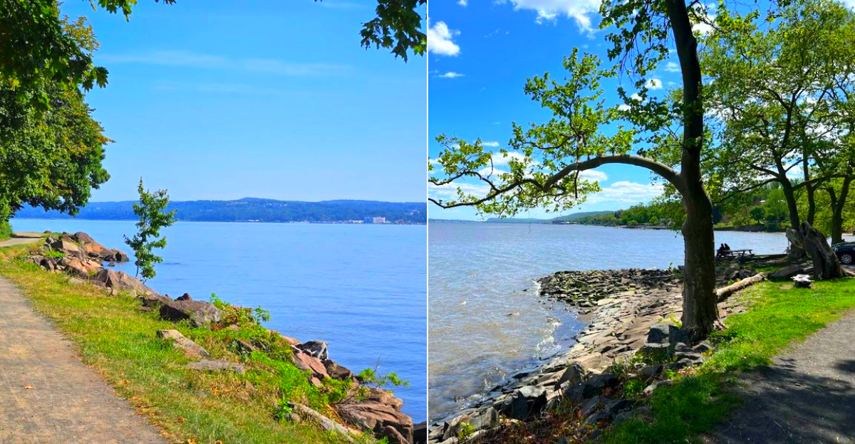 The park sits on a narrow strip of land between the river and the Palisades cliffs, giving it a geography that feels almost theatrical. Towering rock faces rise behind you while the river opens ahead, creating a natural corridor that channels the breeze and amplifies the sense of being somewhere genuinely removed from ordinary life.